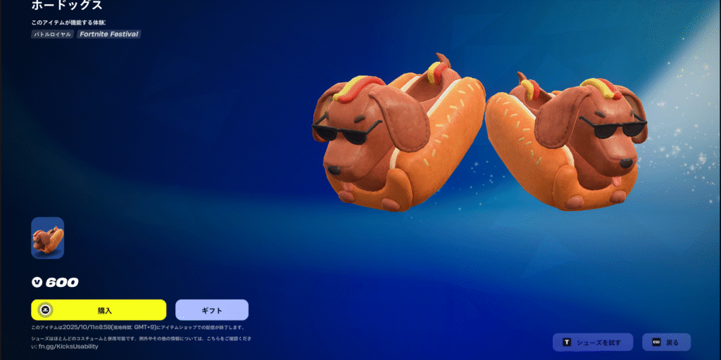2025年10月7日、フォートナイトのアイテムショップにオリジナルシューズ「ホードッグス」が登場しました。