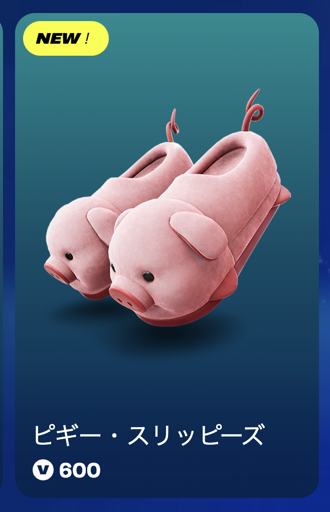 2025年11月5日、フォートナイトのアイテムショップに新しいオリジナルシューズ「ピギー・スリッピーズ」が登場しました。ブタをモチーフにしたデザインで、くりっとした目やかわいいシッポが特徴の、愛らしいスキンとなっています。