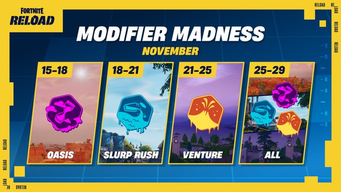 Epic Gamesは、フォートナイトの「リロード」と「リロード・ゼロビルド」にて、期間限定イベント「モディファイア・マッドネス」を開催することを明らかにしました。